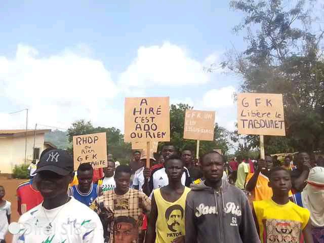 Vu qu'il a décidé de rejoindre le Pdci-Rda, il faille qu'il libère le "tabouret" sans condition. C'est à dire son poste d'élu à la mairie de Hiré. Ainsi, l'on peut le voir clairement sur les messages inscrits sur les pancartes portées par les jeunes déchaînés qui ont envahi la mairie dans la matinée de ce mardi 02 juillet 2024. " A Hiré, c'est ADO ou rien", "GFK, Libère le tabouret", " RHDP ou rien GFK''...
