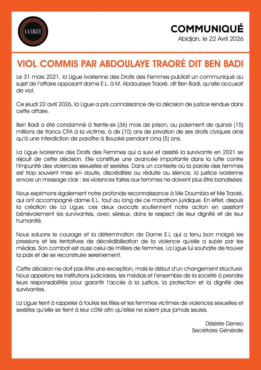 Le 31 mars 2021, la Ligue Ivoirienne des Droits des Femmes publiait un communiqué au sujet de l'affaire opposant dame E.L. à M. Abdoulaye Traoré, dit Ben Badi, qu'elle accusait de viol.