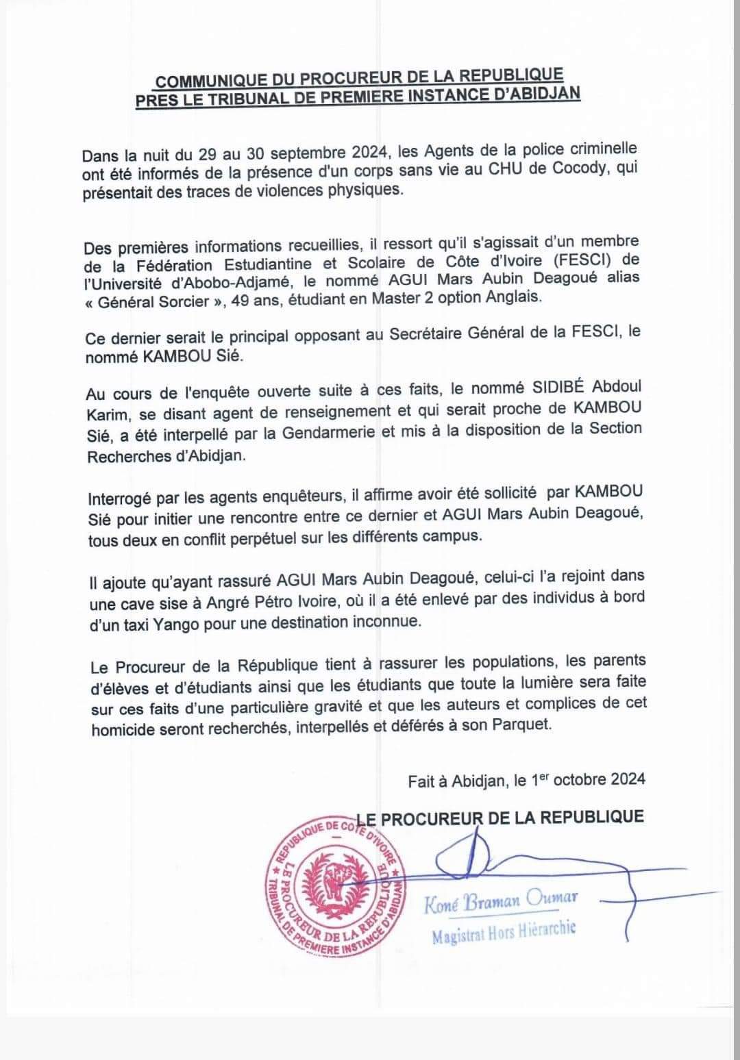 Le Procureur de la République près le Tribunal de Première Instance d’Abidjan a pondu ce mardi 1er octobre 2024, un communiqué sur l’enlèvement et l’assassinat du principal opposant au Secrétaire général de la FESCI, Kambou Sié. Un suspect a déjà été appréhendé. Voici le communiqué du Procureur de la République sur le meurtre de Agui Mars Deagoué dit « Général Sorcier ».