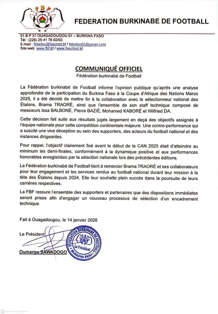La Fédération burkinabè de Football (FBF) a annoncé, ce 14 janvier 2026, la fin de sa collaboration avec le sélectionneur national des Étalons, Brama Traoré, ainsi qu’avec l’ensemble de son staff technique.