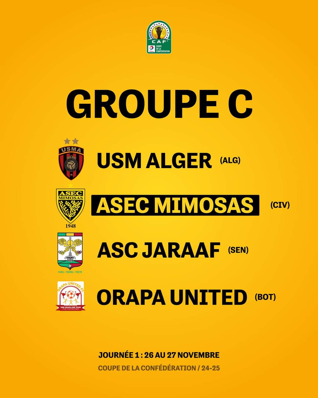 Après leur brillante qualification pour la phase de poules de la coupe de la Confédération, l'ASEC Mimosas est situé depuis ce lundi 7 octobre 2024 sur ses adversaires. Lors du tirage au sort qui a eu lieu, ce jour même, les Mimosas sont dans la poule C où ils héritent du club algérien USM Alger, le Jaaraf de Dakar du Sénégal et le club Botswanais de Orapa United. Une poule plus ou moins abordable pour le représentant ivoirien dans cette compétition.