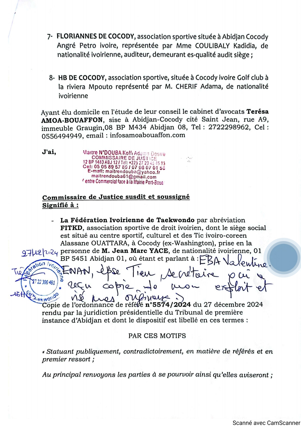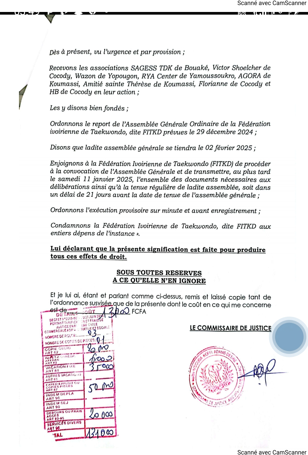 Pour cause d’une ribambelle d’irrégularités élémentaires, selon des acteurs de cette discipline sportive, l’Assemblée Générale Ordinaire (AGO) que Jean Marc Yacé tenait à organiser le 29 décembre 2024 n'aura pas lieu à cette date. Le président contesté par la grande majorité des membres statutaires et son Comité directeur sont contraints de la reprogrammer le dimanche 2 février 2025 à certaines conditions. Telle est la quintessence du verdict du juge des Référés du Tribunal de Première Instance d'Abidjan, ce vendredi 27 décembre 2024, suite à la dénonciation des 175 membres statutaires portant sur les nombreuses violations statutaires en lien à la la tenue de cette AGO. « Enjoignons la FITKD de procéder à la convocation de l'AG et de transmettre, au plus tard le 11 janvier 2025, l'ensemble des documents nécessaires aux délibérations ainsi qu'à la tenue régulière de ladite AG, soit dans un délai de 21 jours avant la date de tenue de l'AGO », telle est l’injonction, sans ambages, faite par le juge. Un véritable camouflet que les 175 membres statutaires viennent à la team Yacé qui est astreint à la tenue régulière de l'AGO. Rendez-vous est donc pris pour le 2 février 2025.