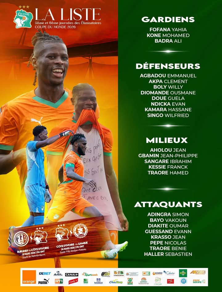 Le sélectionneur des Éléphants, Emerse Faé a rendu publique ce lundi sa liste des 23 joueurs retenus pour affronter le Burundi et la Gambie dans le cadre des éliminatoires de la Coupe du monde 2026.