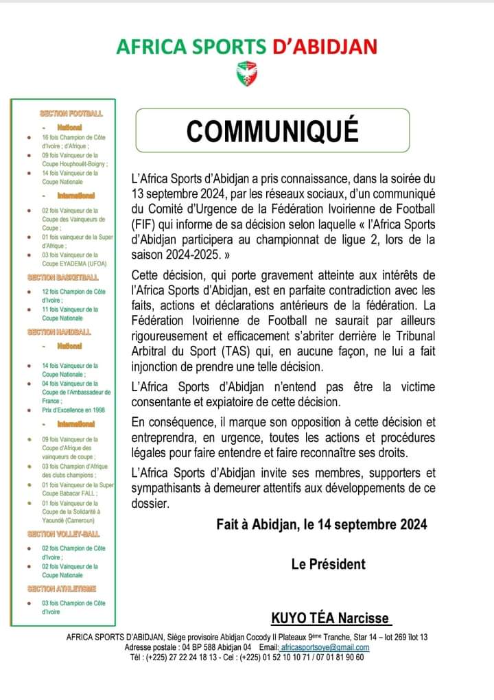 "L'Africa Sports d'Abidjan a pris connaissance, dans la soirée du 13 septembre 2024, par les réseaux sociaux, d'un communiqué du Comité d'Urgence de la Fédération Ivoirienne de Football (FIF) qui informe de sa décision selon laquelle « l'Africa Sports d'Abidjan participera au championnat de ligue 2, lors de la saison 2024-2025.