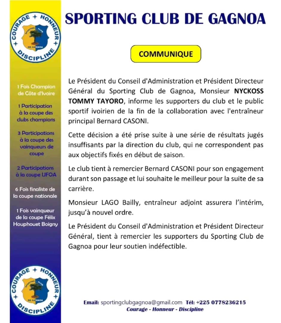 Pour pallier le départ de Bernard Casoni, la direction du club a nommé son adjoint, Lago Bailly Guillaume pour assurer l'intérim. " Monsieur Lago Bailly Guillaume, entraîneur adjoint, assurera l'intérim jusqu'à nouvel ordre", conclut-il. Rappelons qu'après 19 journées de Ligue 2, le Sporting Club de Gagnoa qui visait la montée en Ligue 1, pointe à la 4eme place 32 points.