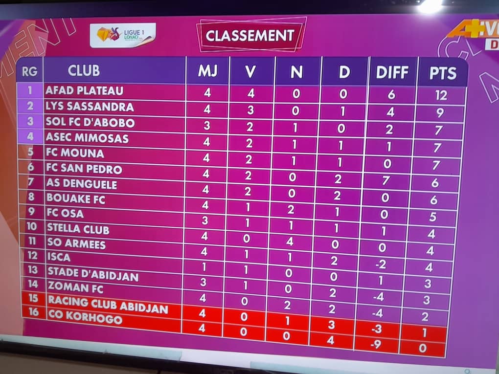 L'autre représentant ivoirien, L'Asec Mimosas en coupe de la Confédération n'a pas rassuré non plus. Les Jaune et Noir ont calé face au Stella Club (0-0). Des résultats qui inquiètent déjà pour la suite de la Ligue 1 et même pour les compétitions africaines. Dans les autres rencontres, ISCA est venu à bout du RCA (1-0). L'Afad continue sur sa lancée avec un sans faute en quatre journées de championnat. Elle a battu le CO Korhogo (1-0). Lys Sassandra a eu raison de Bouaké FC (1-0). Le FC San Pedro est tombé à domicile face à Mouna FC (0-1). Le nouveau promu, FC OSA a étrillé le Denguélé Sport d'Odienné (3-1). Quand Zoman FC se faisait battre par Sol FC.