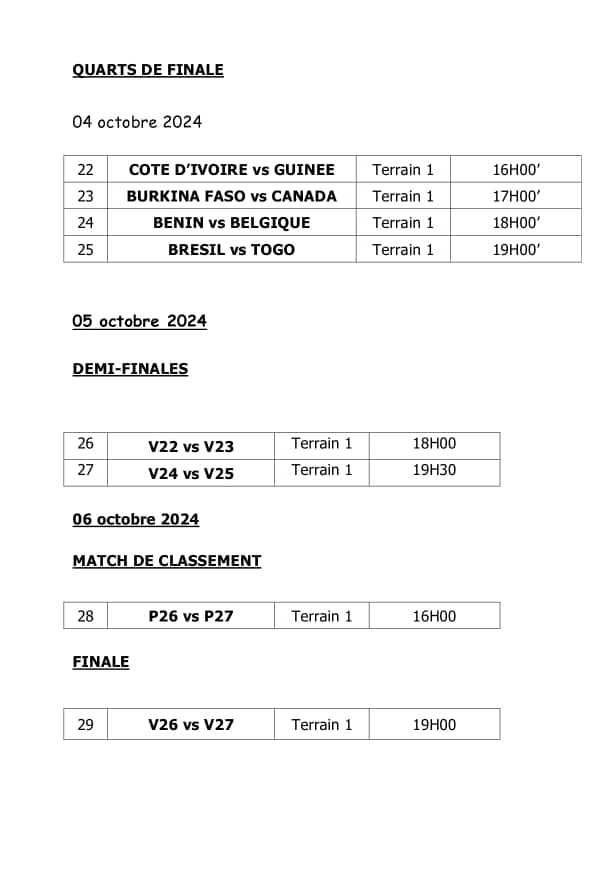 Les Éléphants de Côte d'Ivoire, qui ont fini en tête de leur poule, croiseront le fer avec Syli national de Guinée dans un duel d'éléphants. Le Burkina Faso et le Canada s'empoigneront pour une place en demi-finale. Le Bénin et la Belgique se mesureront pour un ticket dans le dernier carré de la Mara'Monde.