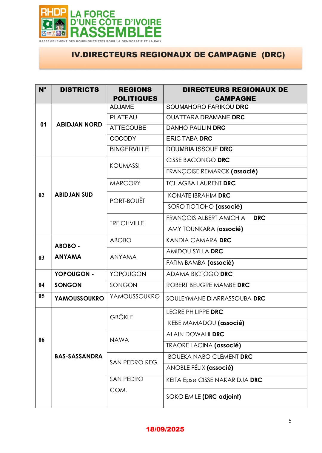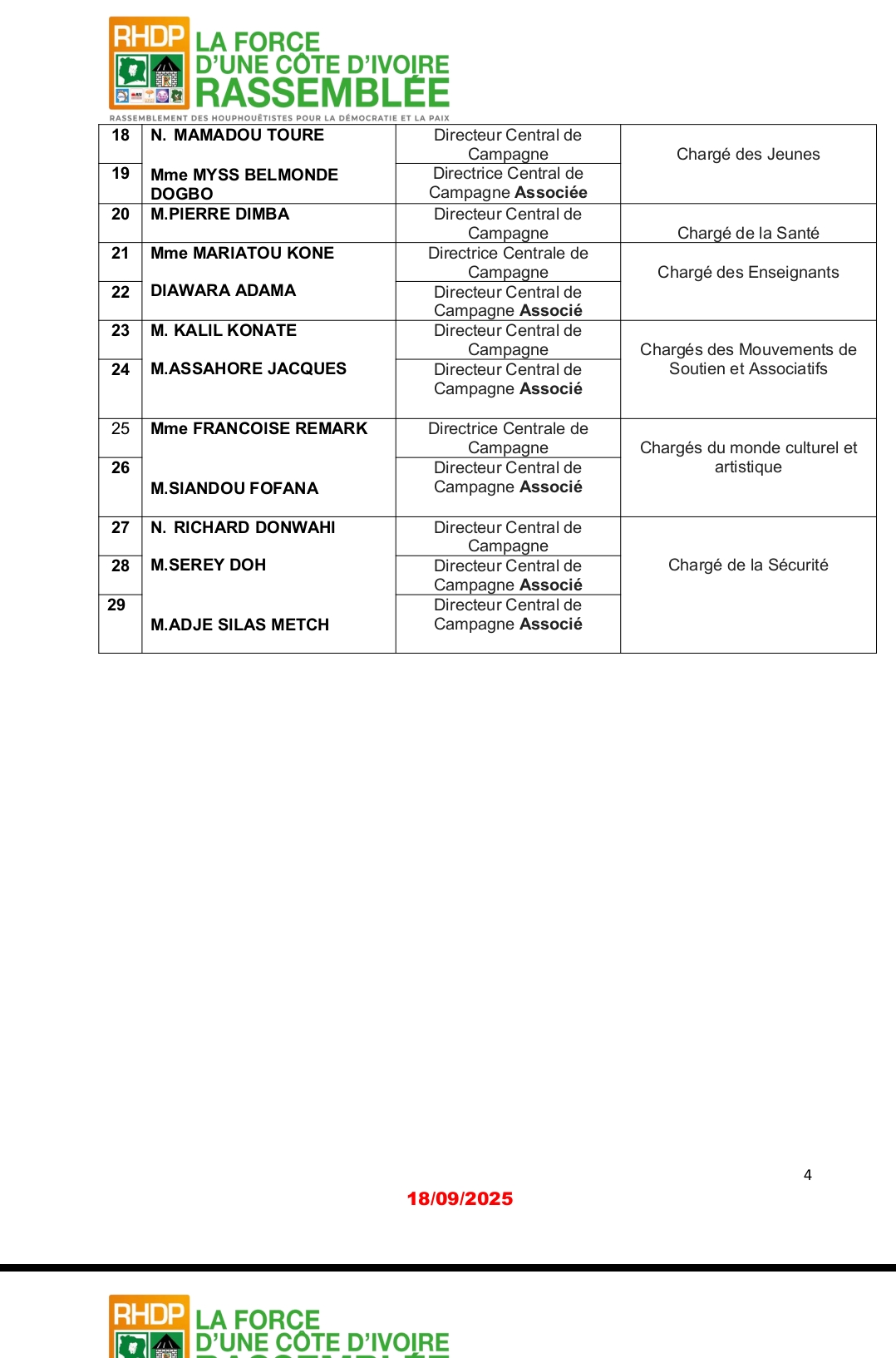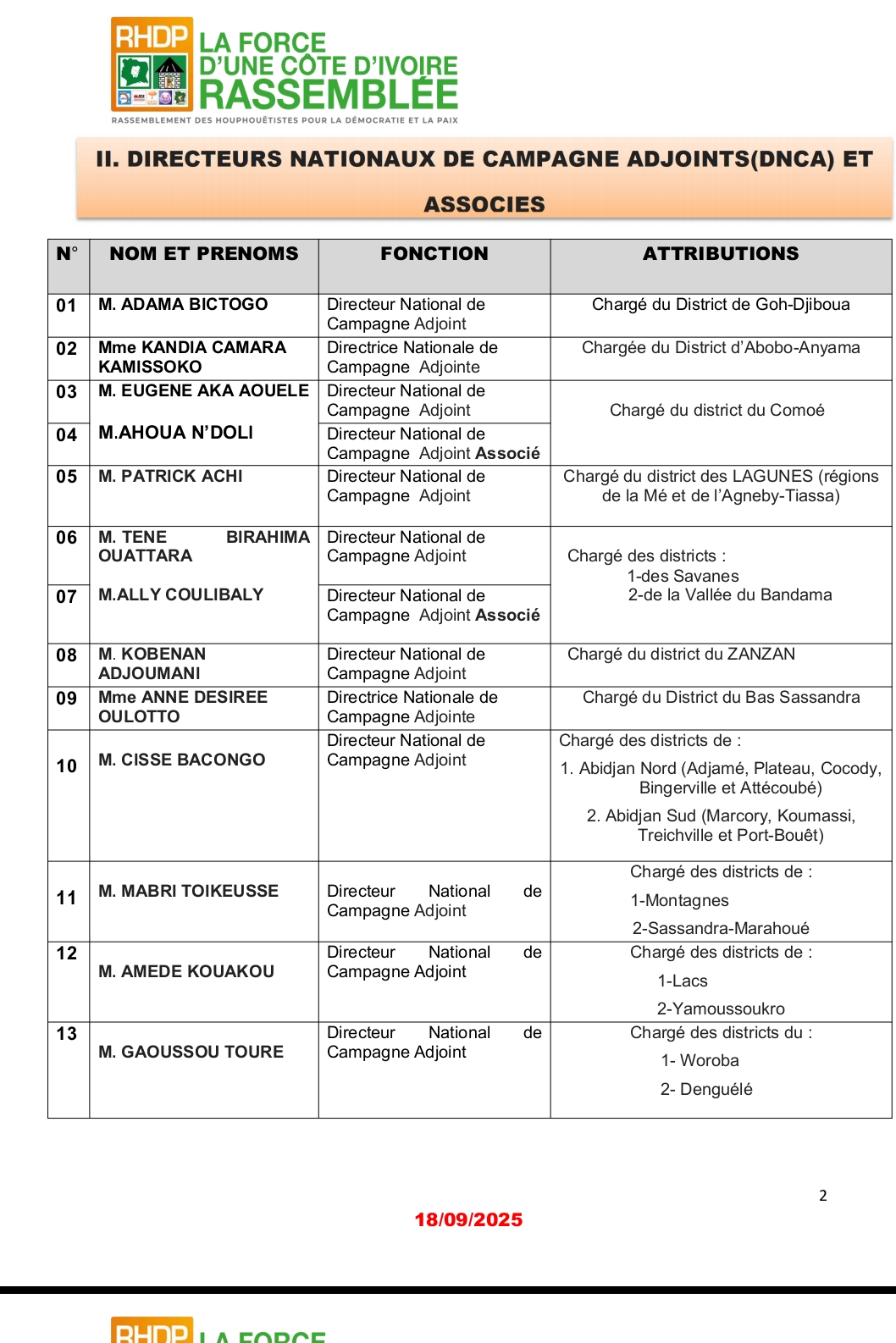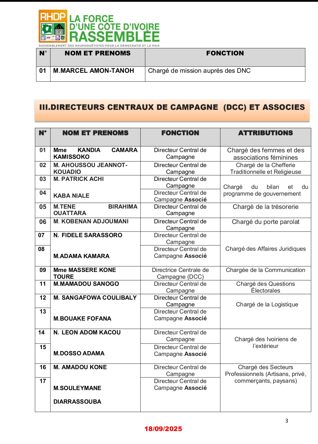 C'est lancé pour la présidentielle 2025. Pour les élections qui auront lieu 25 octobre 2025, chaque camp ménage sa monture. Le Camp présidentiel dirigé par le président sortant Alassane Ouattara a dévoilé son équipe de campagne conduite par le haut représentant du président de la République par ailleurs président du Directoire du RHDP, Gilbert Koné Kafana et le Premier Ministre, Beugré Mambé.