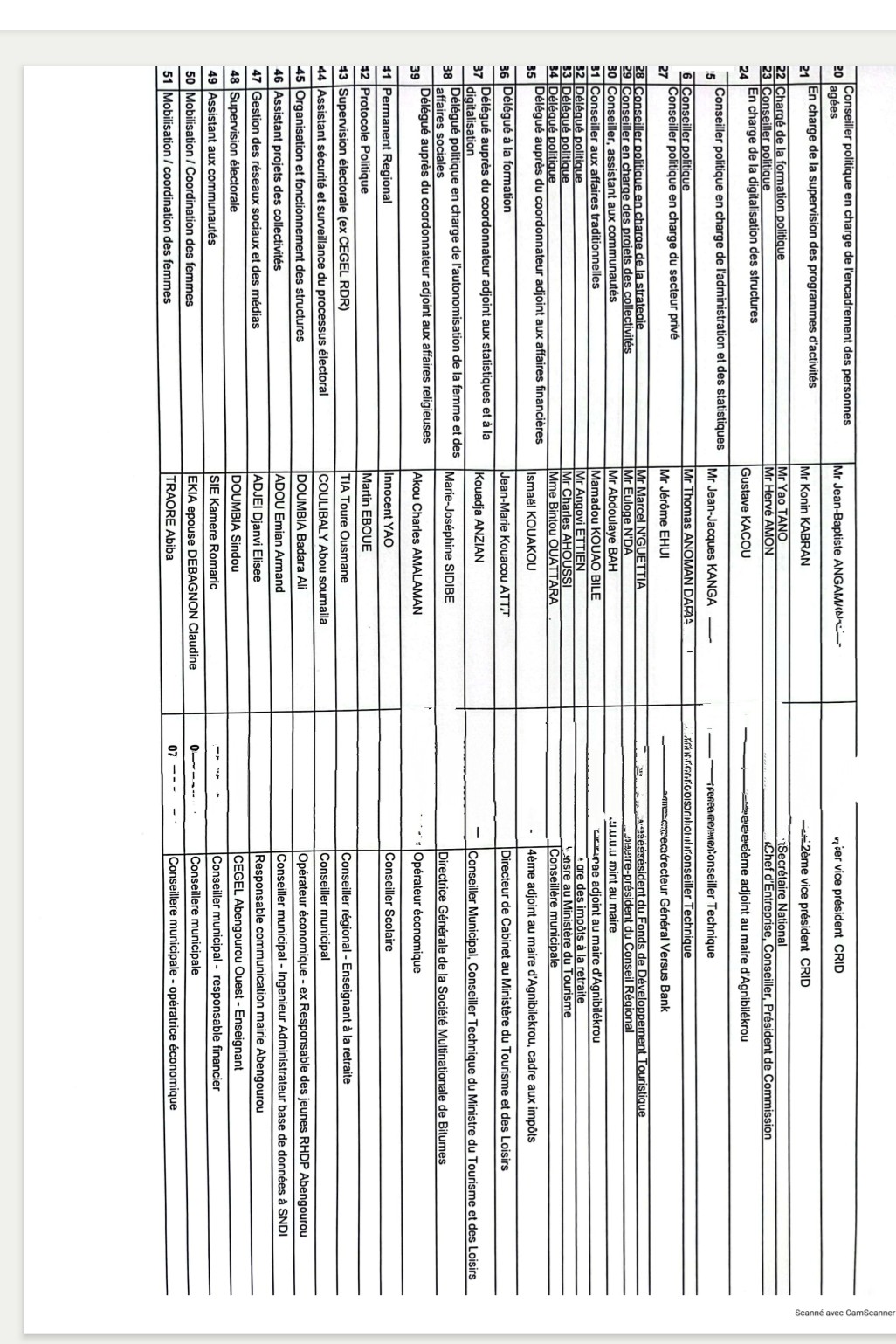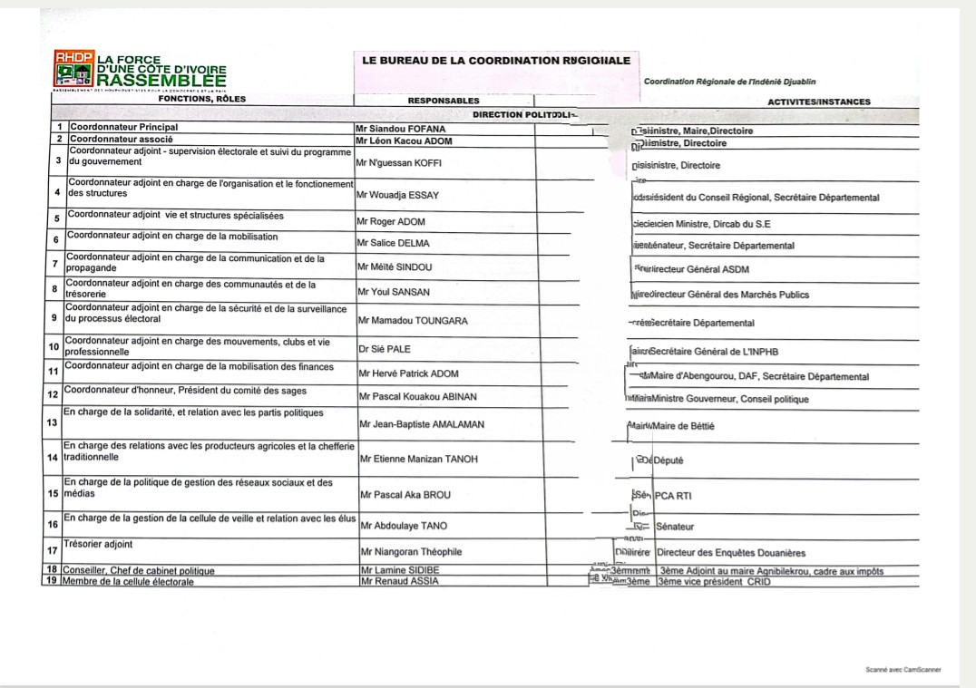 Hormis les coordonnateurs associés et adjoints, les Ministres Léon Houadja Kacou Adom, Nguessan Koffi, Roger Adom, Siandou Fofana a décliné la nomenclature stratégique de la Coordination du parti au pouvoir pour le demeurer dans les trois départements de la région que sont Abengourou, Agnibilekrou et Bettié.