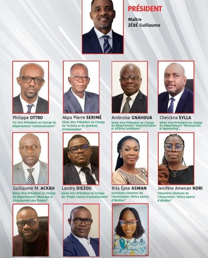 Élu le 9 novembre 2025, le nouveau président de l’ Africa Sports, Me Zébé Guillaume a dévoilé son bureau exécutif.